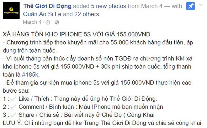 Cụ thể, fanpage này đăng tải một bài viết về chương trình khuyến mại bán 55.000 iPhone 5S với giá chỉ 155.000 đồng một chiếc. Mức giá rao bán này thấp hơn rất nhiều so với mức giá mà Thế Giới Di Động niêm yết trên trang chủ là 6.490.000 đồng.